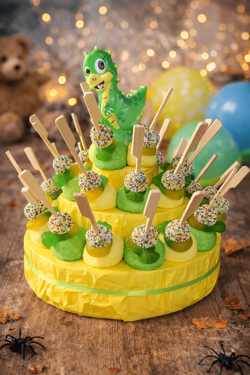 Maar het draait niet alleen om de looks. Onze snoeptaart dino zit boordevol verrukkelijke snoepjes die je smaakpapillen zullen verwennen. Van zoete ananas en kleurrijke berries tot heerlijke spekbollen.