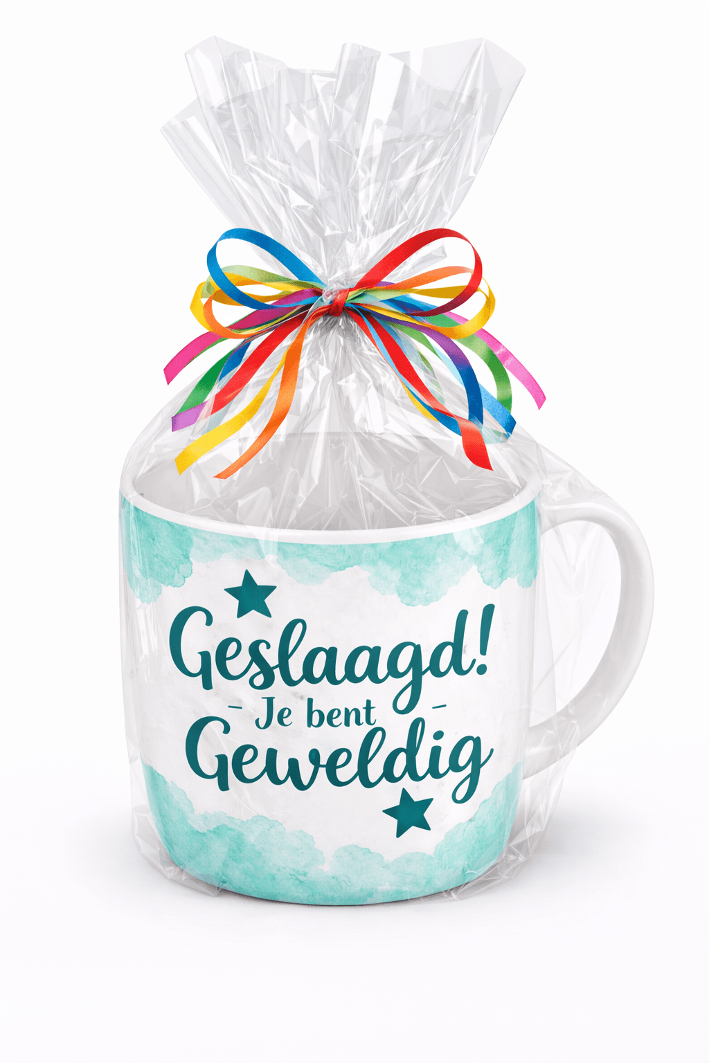De mok wordt ingepakt in doorzichtige folie met gekleurde linten. Eventueel kunt u een eigen tekst kwijt op een extra aangebracht zijden lint om het cadeau nog meer kracht of charme te geven. Op deze manier kunt u uw cadeau nog persoonlijker maken.