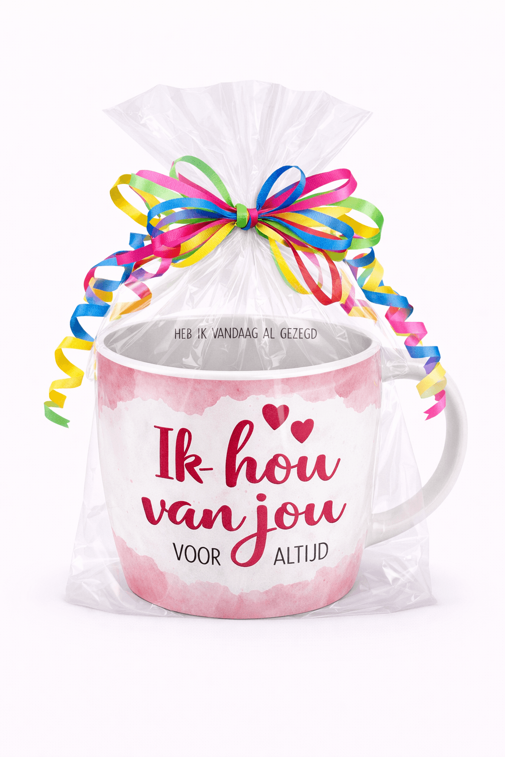De mok wordt ingepakt in doorzichtige folie met gekleurde linten. Eventueel kunt u een eigen tekst kwijt op een extra aangebracht zijden lint om het cadeau nog meer kracht of charme te geven. Op deze manier kunt u uw cadeau nog persoonlijker maken.