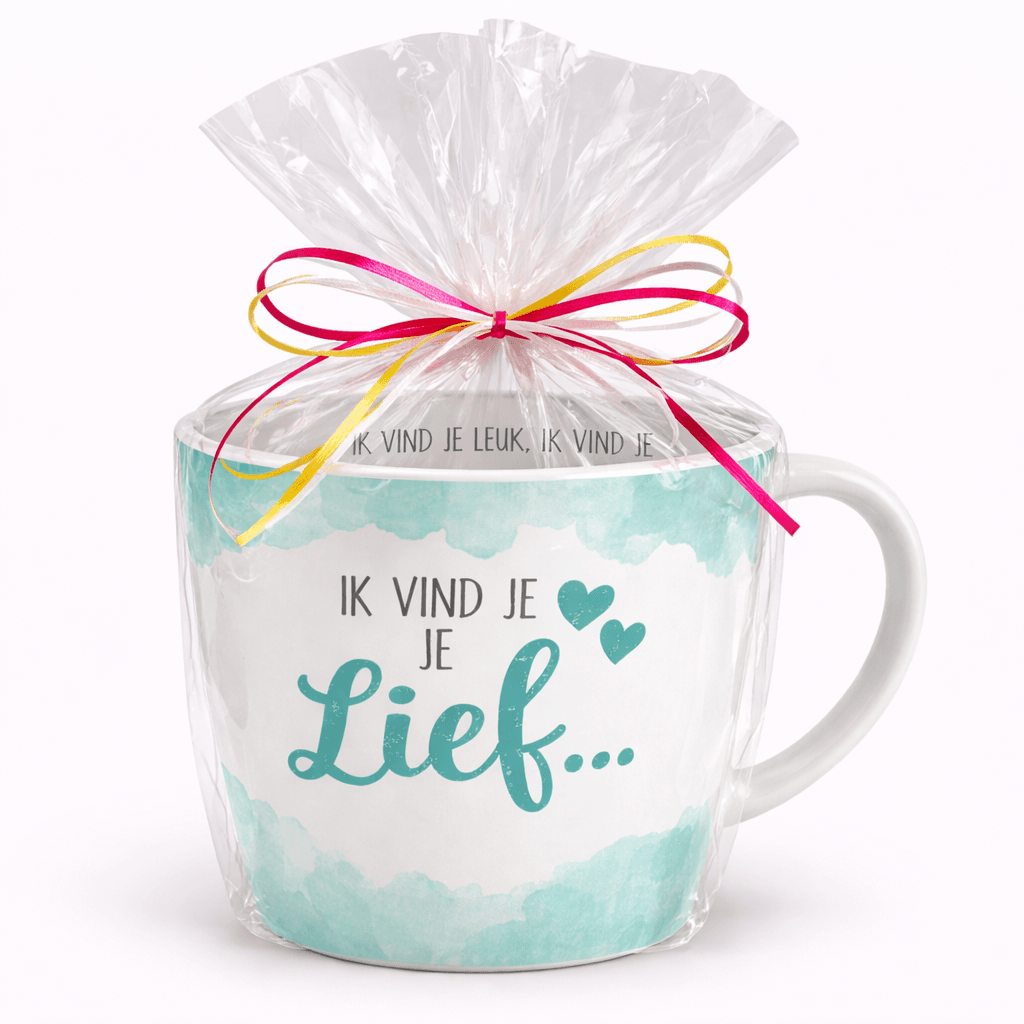 De mok wordt ingepakt in doorzichtige folie met gekleurde linten. Eventueel kunt u een eigen tekst kwijt op een extra aangebracht zijden lint om het cadeau nog meer kracht of charme te geven. Op deze manier kunt u uw cadeau nog persoonlijker maken.