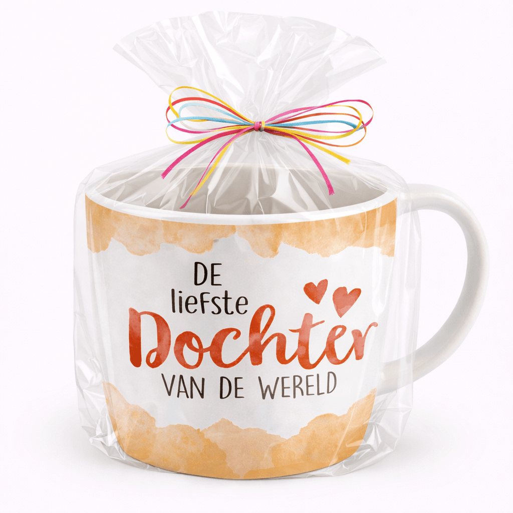 De mok wordt ingepakt in doorzichtige folie met gekleurde linten. Eventueel kunt u een eigen tekst kwijt op een extra aangebracht zijden lint om het cadeau nog meer kracht of charme te geven. Op deze manier kunt u uw cadeau nog persoonlijker maken.
