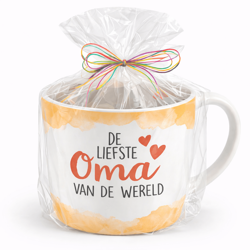 De mok wordt ingepakt in doorzichtige folie met gekleurde linten. Eventueel kunt u een eigen tekst kwijt op een extra aangebracht zijden lint om het cadeau nog meer kracht of charme te geven. Op deze manier kunt u uw cadeau nog persoonlijker maken.