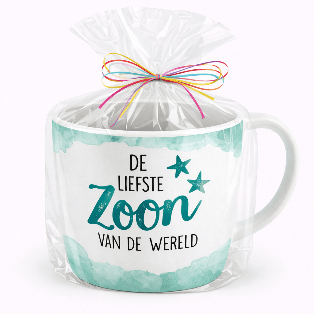 De mok wordt ingepakt in doorzichtige folie met gekleurde linten. Eventueel kunt u een eigen tekst kwijt op een extra aangebracht zijden lint om het cadeau nog meer kracht of charme te geven. Op deze manier kunt u uw cadeau nog persoonlijker maken.