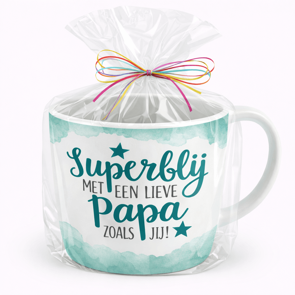 De mok wordt ingepakt in doorzichtige folie met gekleurde linten. Eventueel kunt u een eigen tekst kwijt op een extra aangebracht zijden lint om het cadeau nog meer kracht of charme te geven. Op deze manier kunt u uw cadeau nog persoonlijker maken.