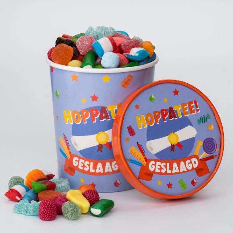 Ontdek een wereld van zoete verleiding en verras hem of haar met onze exclusieve snoeppot of candy bucket met de tekst “Geslaagd!” Deze prachtige pot, rijkelijk gevuld met een uitgebalanceerde mix van heerlijke snoepjes, smaakvolle drop of verrukkelijke toffees, is niet alleen een traktatie voor de smaakpapillen, maar ook een perfect cadeau om iemand te feliciteren, te bedanken of een opkikkertje te geven.