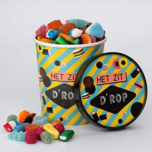 Ontdek een wereld van zoete verleiding en verras hem of haar met onze exclusieve snoeppot of candy bucket met de tekst “Het Zit D’rop” Deze prachtige pot, rijkelijk gevuld met een uitgebalanceerde mix van heerlijke snoepjes, smaakvolle drop of verrukkelijke toffees, is niet alleen een traktatie voor de smaakpapillen, maar ook een perfect cadeau om iemand te feliciteren, te bedanken of een opkikkertje te geven.