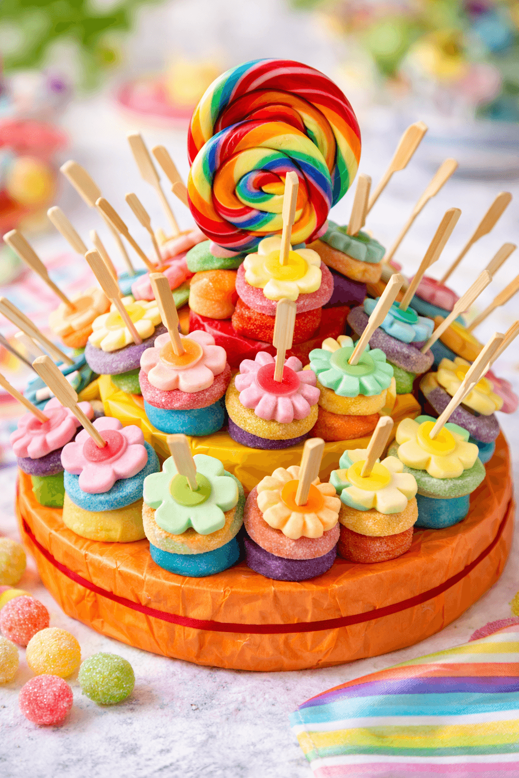 Deze snoeptaart in fleurige kleuren is een echte blikvanger op tafel.