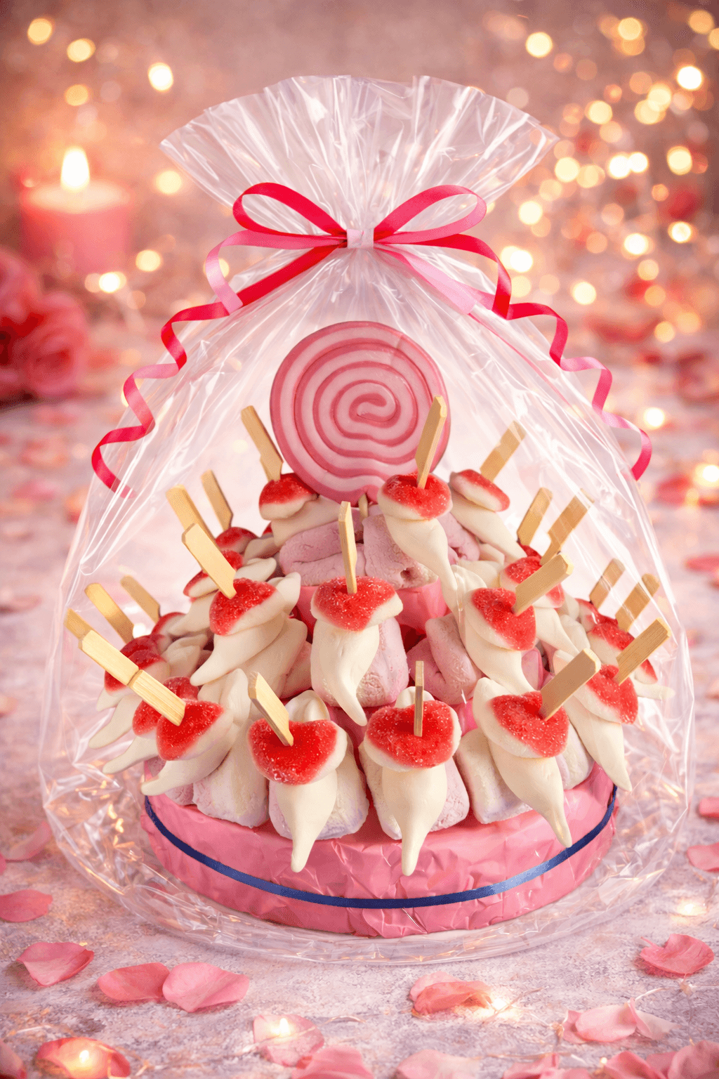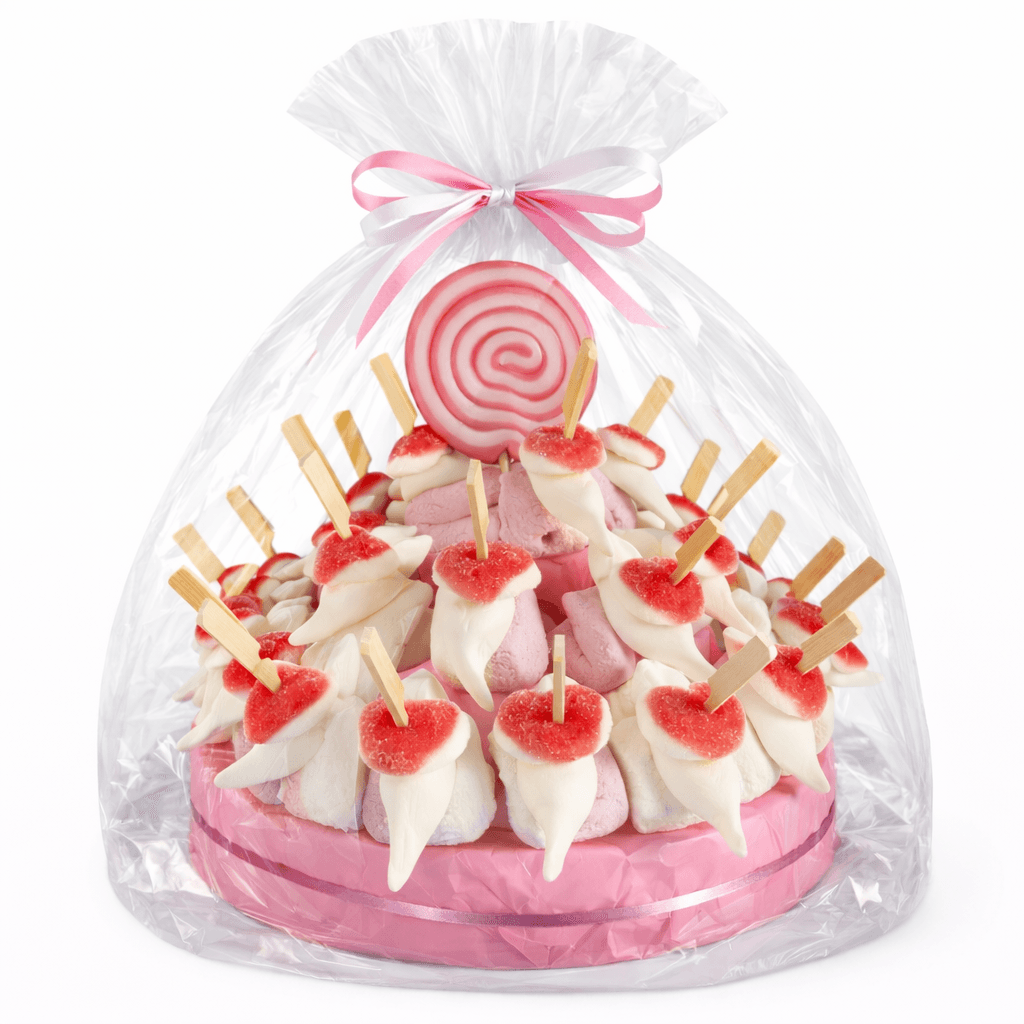 Maar het draait niet alleen om het uiterlijk. Onze snoeptaart geboorte meisje zit boordevol heerlijke snoepjes die je smaakpapillen zullen verwennen. Van zachte marshmallows en witte muizen tot heerlijke hartjes, elke hap biedt een smaakvolle viering van deze bijzondere gelegenheid.