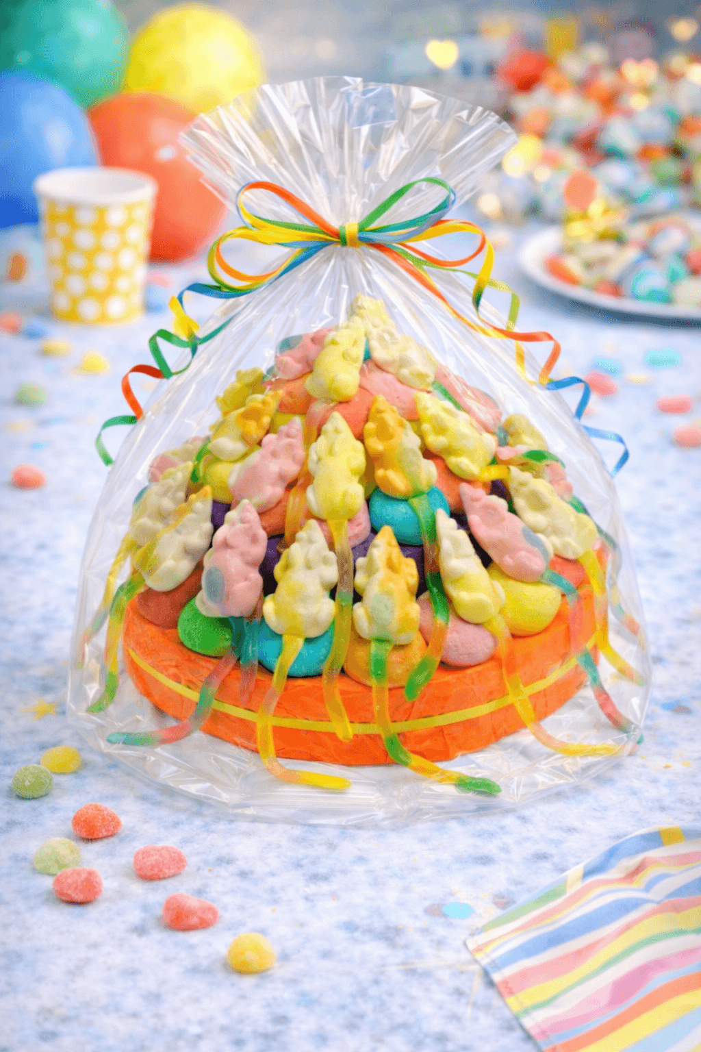 Ontdek een betoverende traktatie vol kleur en zoetheid met onze snoeptaart gekleurde snoepmuizen! Deze unieke lekkernij zal niet alleen de harten van snoepliefhebbers veroveren, maar ook een vleugje vrolijkheid toevoegen aan elke feestelijke gelegenheid. Laat je verleiden door de zoete en speelse smaken van deze schattige snoepmuizen.