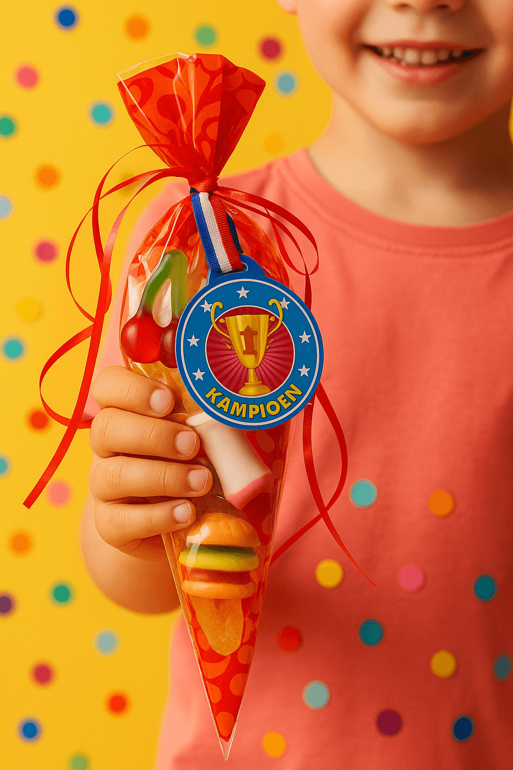 De snoepzak is gevuld met een vrolijke variatie aan lekkernijen zoals winegums, spekjes en zure snoepjes. De zak is feestelijk verpakt met krullint en voorzien van een medaille met de tekst “Voor de Kampioen”, aan een rood-wit-blauw lint — zodat hij direct om de nek gehangen kan worden bij de finish.